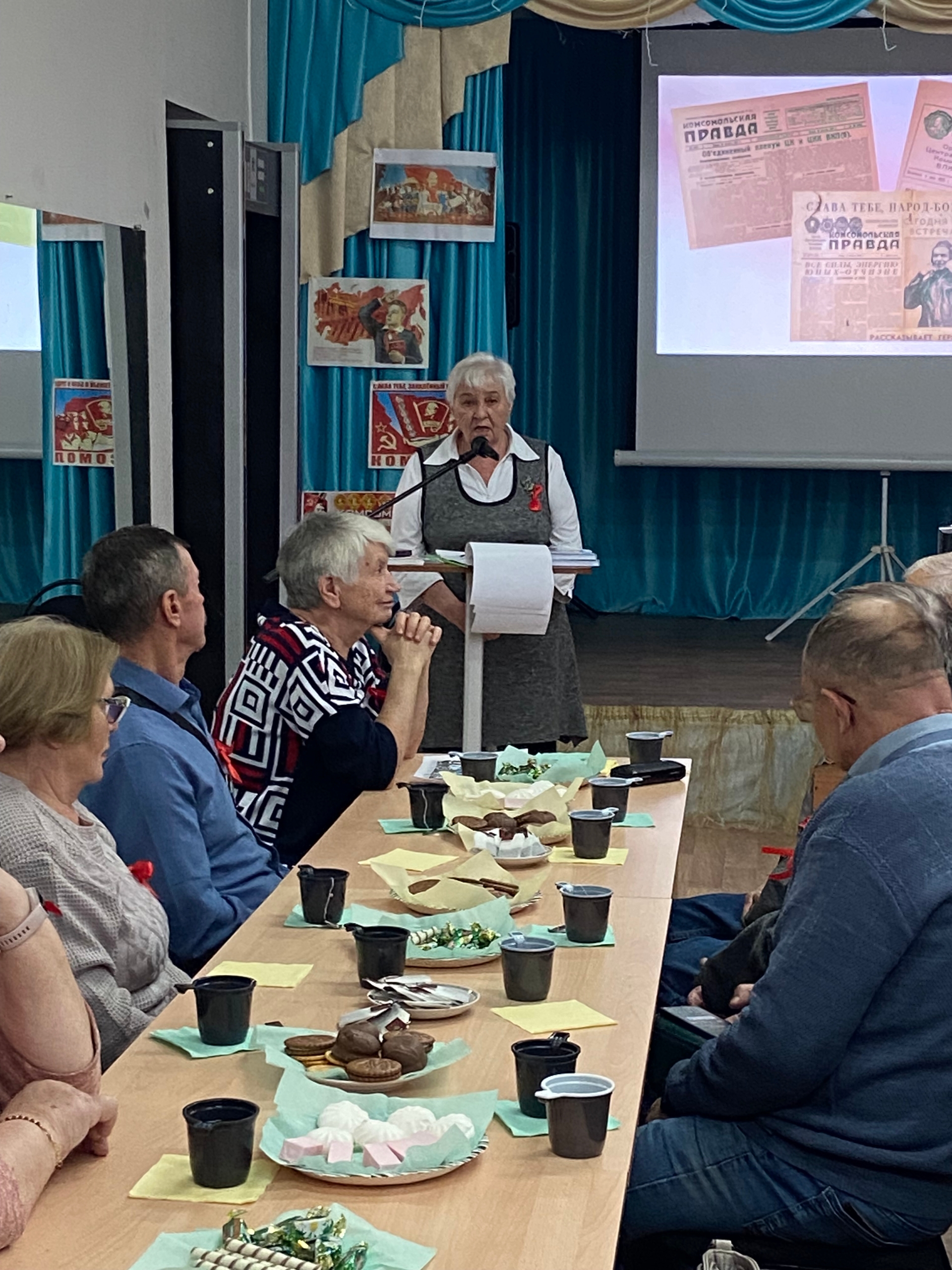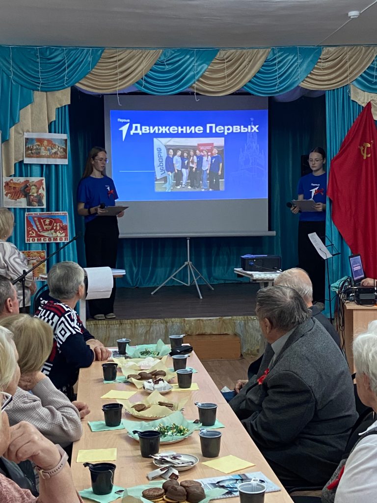 На встрече присутствовали Л.В. Семьина, Н.А. Богомазова, Т.Н. Потапова, О.В. Цыганова и ребята из СШ №2 Валова Анфиса и Соколова Маша. Они рассказали старшему поколению о проектах, организуемых Всероссийским молодёжным движением «Движение первых», чем они живут, и о чём они мечтают.