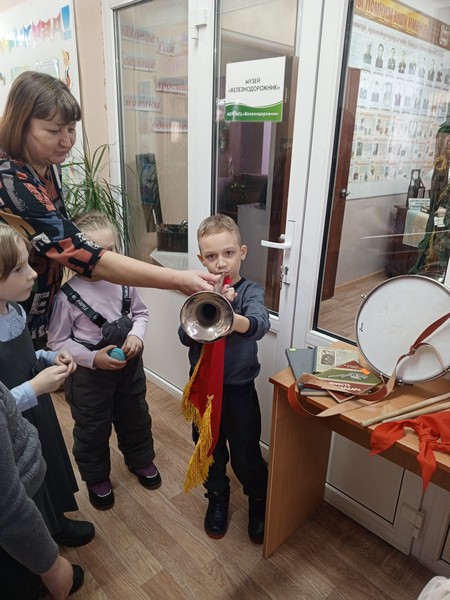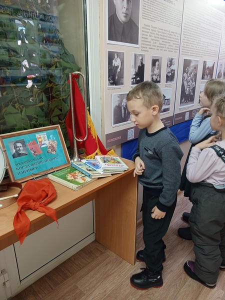 Также ребятам был проведен обзор выставки-инсталляции «Аркадий Гайдар. Когда жизнь подвиг и пример…», на которой были представлены пионерские атрибуты и книги А.Гайдара».